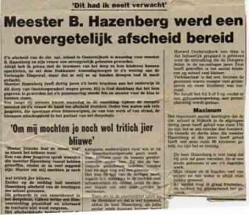 Hazenberg kwam jarenlang met de fiets van Dokkum naar Easternijtsjerk. Hij had nogal moeite om zijn rijbewijs te halen: de nieuwe auto stond al in de garage, maar slagen wilde maar niet lukken. Tot zijn vrouw het de zevende keer met een list probeerde. Ze gaf hem stiekem een kalmeringstablet en vertelde, tot Hazenbergs grote verrassing, dat hij die ochtend rij-examen zou moeten doen. ‘Maar mijn klas dan,’ protesteerde hij nog. Ik heb meester Wiersma gewaarschuwd, die heeft al een vervanger geregeld. Hazenberg slaagde!