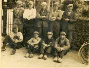 Voorheen was niet iedereen in het bezit van een horloge. Toch moesten de arbeiders op tijd op hun werk zijn. Daar was iets op gevonden: verschillende keren per dag werd de dorpsklok geluid. Zo fietste ik vroeger geregeld door Waaksens (Littenseradiel) waar de klok om 8, 12 en 4 uur luidde. Dat had te maken met de ‘skoften’ tijdens een werkdag voor de arbeiders. Voor een groot gedeelte is dat tegenwoordig nog zo, alleen is niet meer altijd duidelijk waarom de klok in Easternijtsjerk bijvoorbeeld om 1 uur ’s middags wordt geluid. Dat was voorheen het moment waarop de arbeiders weer aan het werk moesten na de middagmaaltijd. Hier hebben zich een aantal verzameld bij de hervormde pastorie, gereed om weer aan de slag te gaan, de fietsen staan klaar, maar eerst even poseren voor de fotograaf. Let ook even op het hek rond het pastorieterrein: de groengeverfde palen, later nog gebruikt bij It Koetshûs. Rechts al de heg, later als omheining in gebruik.