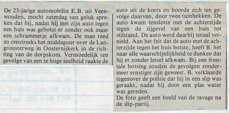 Hij kwam er zonder een schrammetje vanaf omdat de auto een halve draai maakte en de auto het huis (Langgrousterwei 5) met de achterkant raakte.