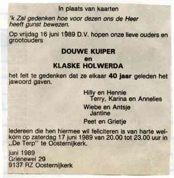 Zo kwam ik een keer via de Bartenswei naar Bollingwier en zag dat het arbeidershuis van Hoekstra (nu woont Ronnie Jonker daar) leeg stond. Ik ging naar de boerderij en daar stond Oege Hoekstra: "Hoor eens Douwe, wat hoor ik, woon je niet meer in It Moddergat?" Hij wilde eerst niet geloven dat wij in Emmeloord woonden en toen ik vroeg naar dat arbeidershuisje dat leegstond, zei hij: "Daar kunnen jullie wat mij betreft morgen wel in, over de prijs worden jij en ik het altijd eens”.