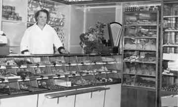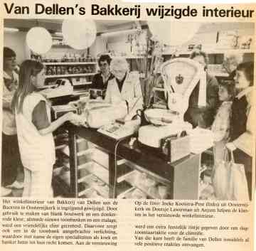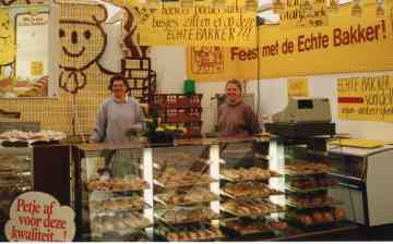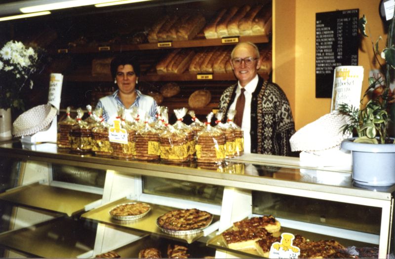 Eén of andere aanbieding voor onze klanten hebben we toen niet gehad, folderen deden wij ook niet aan, een advertentie in de krant, dat was alles. Later hebben wij de winkel wat verbouwd, de deur hing er op in keer bij!, toen hebben we een pakje beschuit en een halve krentenbrood als aanbieding voor onze klanten gehad, maar dat was het wel zo ongeveer. Er stond een bruine dichte toonbank in de winkel met één lade, de etalage stelde ook niet veel voor: er was een raam en daarnaast de deur. Bij de eerste verbouwing hebben we de toonbank nog overdwars gehad, maar bij de tweede verbouwing, zo’n 25 jaar geleden (bij de opening een slagroomgebakje als cadeau), zijn toonbank en etalage geworden zoals het tot het laatst nog was.