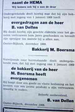 In 1968 had Mark Boersma hier in Nijtsjerk zijn bakkerij te koop. Hij en zijn vrouw Geartsje hadden er genoeg van en Mark wilde wel ophouden en terug naar de Wâlden. Heit had dat gehoord en stapte op een dag naar Mark. Wij wisten thuis van niets want heit regelde alles, ja, wij wisten wel dat hij voor een bakkerij weg was, meer niet. Hij zei tegen Mark: “Jij hebt je bakkerij te koop gehad, toch?” Mark zei dat de zaak eigenlijk nog wel te koop was en toen raakten ze in onderhandeling. Als eindbesluit kocht heit de bakkerij hier aan De Buorren voor f 28.000,-. Het was 2 oktober en toen hij thuis kwam, zei hij: “Ik heb de bakkerij in Nijtsjerk gekocht, jullie kunnen nu wel trouwen.” Wij wisten niet wat ons overkwam, Annie en ik hadden al drie jaar verkering, maar over trouwen hadden we nog niet echt nagedacht, wij waren 20 en bijna 22 jaar, zoiets had nog wel tijd.