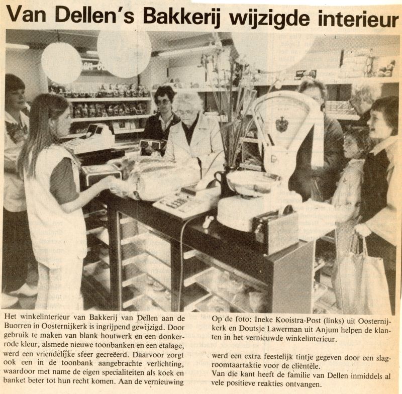 De eerste die ons in de winkel hier geholpen heeft, was Tieteke Feenstra (nu Tieteke Faber), zij kwam op zaterdag toen ze van school was. Later zijn er nog heel wat anderen geweest: Ria Bosgra, Akkie Weidenaar, Ineke Post, Gerrie van Driesum, Doutsje Lawerman, Tiny Talstra, Janet Postmus, Janneke Weidenaar, Jannie Visser en in de laatste periode Nicole van der Mossel en Thea Rozendal. Dochter Rosalyn heeft ook een tijdje geholpen, dat was vanzelf prachtig: mem en dochter samen achter de toonbank! Gerrie van Driesum stond hier in de winter fan 1979 toen er zoveel sneeuw was gevallen dat er een crisiscentrum in Eanjum gevormd werd en het brood met de kraan fan Frans Postmus naar Easternijtsjerk werd gebracht. Daar hebben wij niets van gemerkt want wij zaten op de Canarische Eilanden!