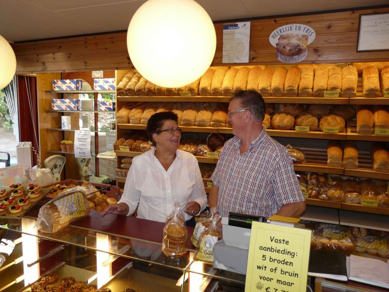 Wij hebben onszelf de laatste jaren ook een strak schema opgelegd, Durk en ik. Wij bakten natuurlijk alle dagen brood maar daarnaast deden wij alle dagen wat anders. Dat ging dan in de vriezer en alle dagen werd er uitgehaald wat nodig was. Zo hadden we dinsdags alle soorten (oranje)koek, meestal vier platen vol. Woensdags maakten we roggebrood en het beslagwerk voor het gebak. Roggebrood moet wel 12 uur in de oven, in die tijd kon je de oven nergens anders voor gebruiken. Donderdags de krenten- en het suikerbrood en de rest van het beslagwerk. Vrijdags was het tijd voor de luxe broodjes en werden de taarten enz. afgemaakt met slagroom en zo. Wij werkten meestal ook niet langer dan tot 12 uur, half één, eerder was dat vanzelf wel tot zes uur. Als je dat zo bedenkt en berekent dat wij elke week minimaal 55 uur werkten en dat 47 jaar lang, dan betekent dit dat wij in uren wel 6 jaar langer gewerkt hebben dan iemand die ook 47 jaar lang werkte, maar dan 40 uur per week.