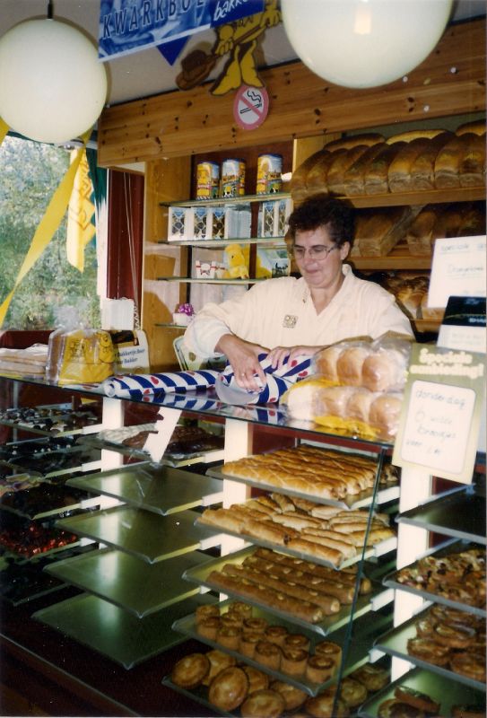 Eén of andere aanbieding voor onze klanten hebben we toen niet gehad, folderen deden wij ook niet aan, een advertentie in de krant, dat was alles. Later hebben wij de winkel wat verbouwd, de deur hing er op in keer bij!, toen hebben we een pakje beschuit en een halve krentenbrood als aanbieding voor onze klanten gehad, maar dat was het wel zo ongeveer. Er stond een bruine dichte toonbank in de winkel met één lade, de etalage stelde ook niet veel voor: er was een raam en daarnaast de deur. Bij de eerste verbouwing hebben we de toonbank nog overdwars gehad, maar bij de tweede verbouwing, zo’n 25 jaar geleden (bij de opening een slagroomgebakje als cadeau), zijn toonbank en etalage geworden zoals het tot het laatst nog was.
