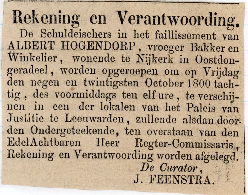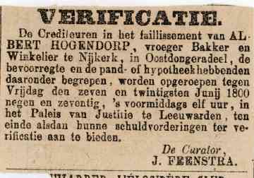 Twee faillissementen in acht jaar tijd. Ook van Grietje Ypes Kingma, weduwe van bakker Gerrit Foppes Dijkstra komt een oproep voor schuldeisers in de krant die, voor zover het bedrag van het de nalatenschap het toelaat, haar schulden kan innen. Ook deze bakker moet het dus niet gemakkelijk hebben gehad en dat wijst op de slechte tijd, ook voor bakkers. Toch houdt rentenier Ernst Bokkes vol want hij moet immers ook “troch de tiid”.