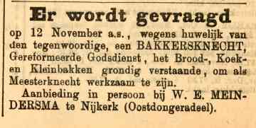 Wigger Ernstes Meindersma zal niet lang in deze familie bakkerij blijven. Het bevolkingsregister noemt hem “bakker en landbouwer” en dat wijst er al wat op dat hij zich wellicht meer tot het boerenwerk voelt aangetrokken. In ieder geval verhuurt zijn vader de bakkerij in 1900 aan Eeltsje Dijkstra, nadat eerst was getracht de boel te verkopen. Eeltsje moest elk jaar ꬵ 140,- opbrengen, maar het leek hem beter af te gaan dat zijn voorgangers want in 1902 is hij in staat om de bakkerij over te nemen. Hij moet meer dan ꬵ 1687,- betaald hebben, want dat wordt volgens een advertentie eerst al geboden.