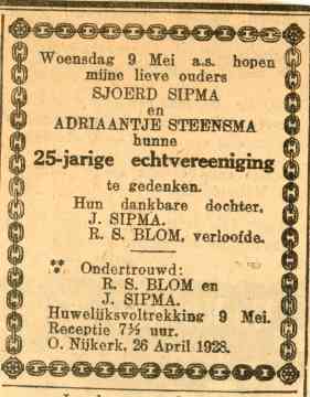 Het jaar dat Sjoerd Sipma 25 jaar getrouwd was en tevens 25 jaar bakker in Nijtsjerk, was ook zijn laatste jaar. Hij heeft een huis laten bouwen aan de Mûnewei (voorheen “Heite Hûs”, nu een nieuwe woning Mûnewei 18) en heeft de bakkerij overgedaan aan Melle Boersma. Sipma stond in het hele land bekend als konijnenfokker, heeft daar vele prijzen mee gewonnen. Die konijnen hield hij in de schuur en de veestal die bij de bakkerij hoorden.