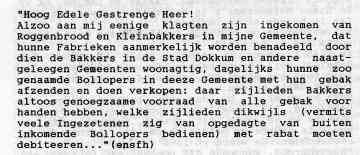 >>“wij verbieden bij deezen wel expres alle invoer van Roggenbrood en grauwe weiten Bollen uit andere Districten of Steden, binnen dit District, tenzij bij de invoer geblijke dat voorgeschreven belastings van zes penningen op ieder Roggebrood en twee penningen op ieder grauwe weiten Bolle, bij de gaarder van zodanig dorp als waarna het Brood en Bolle vervoerd zal worden, is aangegeven en betaald”.