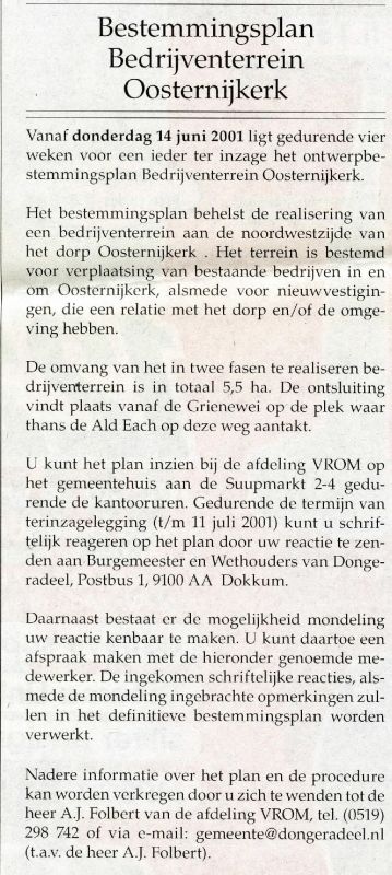 - S.B.O.: De initiatiefnemers richten een stichting op: Stichting Bedrijventerrein Oosternijkerk. Stichting gaat het geheel bouwrijp maken dit d.m.v. een exploitatie overeenkomst met de Gemeente.