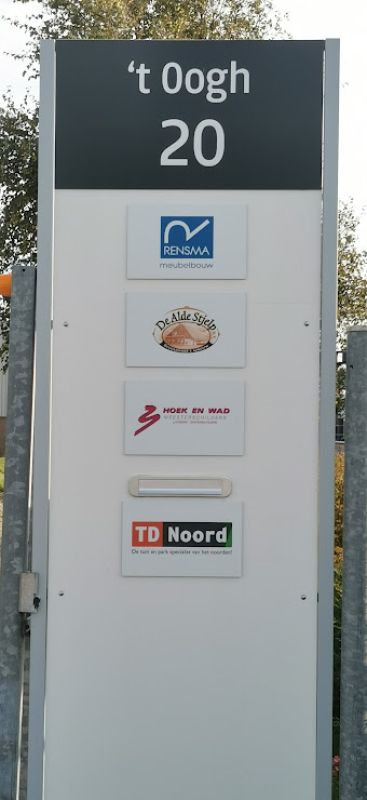 Meerdere malen overleg gehad om alsnog een soort namenbord gerealiseerd te krijgen. Dit zou geplaatst moeten worden bij de ingangsweg. Hierop zou plaats zijn voor ieder bedrijf een eigen universeel en demontabel bordje. Hiervoor was echter niet voldoende draagvlak. Ook hier had Gunnar Daan graag in mee willen denken. Dit had iets heel bijzonders kunnen worden eventueel zelfs met een plattegrond erbij. Dus niet een standaard frame met bordjes. Naast iedere ingang bij ieder bedrijf zou nog een mini uitvoering hiervan geplaatst kunnen worden met bedrijfsnaam en huis nummer. Iets unieks. Jammer, jammer.
