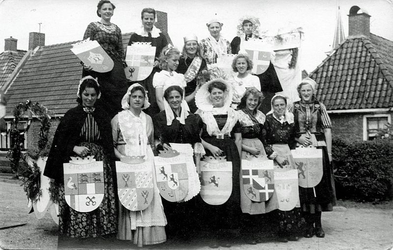 Er is ook nog een foto bewaard gebleven van “De Elf Provinciën, de Koningin en twee hofdames” tijdens dezelfde optocht. De foto is genomen op de Boate’ Hoeke, voor het huis van Jappie Poutsma. Toen woonden daar Folkert en Sijtske Sijtsma. Het huis ernaast dat dwars op de straat staat was van slager Holwerda, nu staat daar de nieuwe woning van Geertje Postmus-Kooistra. Van het huis op de hoek van de Langgrousterwei is nog net een stuk dak met schoorsteen te zien.
