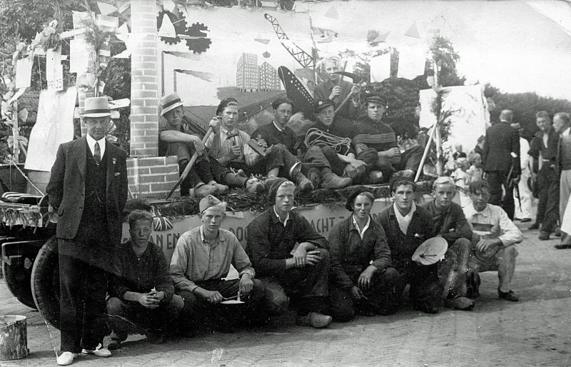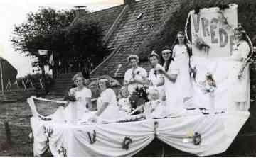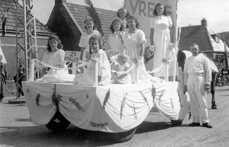 De winnaar van de eerste prijs is de foto met de wagen waarop allemaal ambachten werden uitgebeeld. De titel van de wagen was ‘Wint de Vrede’ en de spreuk onderaan de wagen (niet zichtbaar achter de zittende ‘ambachtslieden’) was: “Met man en macht, door eigen kracht, zal Nederland herrijzen”. De wagen was zodanig opgebouwd dat er midden op de wagen een wand stond waarop aan beide kanten beelden uit “Herrijzend Nederland” waren afgebeeld. Daarvoor zaten de jongemannen die allemaal een beroep uitbeeldden. Op de foto is de kant te zien waarop een haventoneel is afgebeeld met schepen en kranen. Dat fraaie schilderwerk werd gedaan door Piet Boon, onderduiker bij Pieter en Ymkje Terpstra, kruideniers in het pand aan De Buorren waar Jappie en Annie Tanje nu wonen. Dit pand was jarenlang een kruidenierszaak. Piet Boon is trouwens later met de dochter van Pieter en Ymkje getrouwd en woonde in Den Helder.