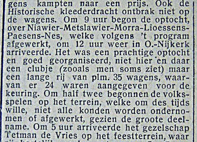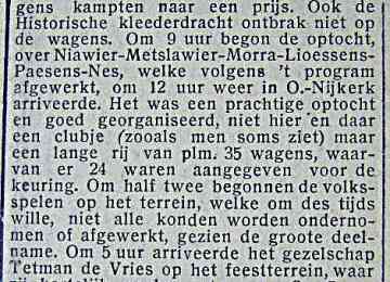 Zoals nu nog steeds was ook toen al de optocht met versierde wagens een belangrijk onderdeel van het feest. Zoals nu nog steeds werd ook toen al een uitgebreide rondrit gemaakt langs de buurdorpen! Dat er maar liefst 35 wagens deelnamen aan deze optocht zegt veel over de bereidheid van de dorpsgenoten om de handen uit de mouwen te steken voor een geslaagde feestelijke optocht: ook dat is nog steeds het geval!