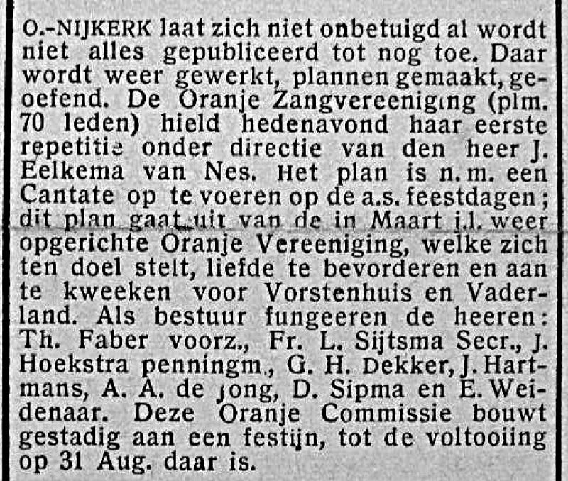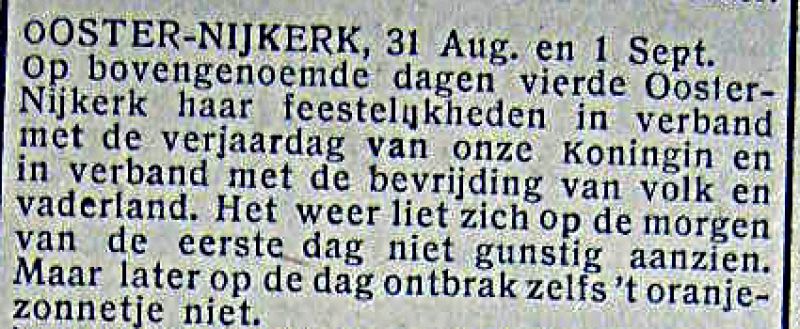 Na afloop van de feestelijkheden stond er een uitgebreid artikel in de krant waardoor we goed ingelicht zijn omtrent de feestelijkheden. Het valt op dat de feesten op het tijdstip gevierd worden waarop anders de verjaardag van de koningin gevierd werd: 31 augustus, verjaardag van koningin Wilhelmina. Dat lijkt ook logisch gezien de tijd die nodig was om uitvoerige voorbereidingen te treffen. Daarnaast was natuurlijk het Oranjebestuur de organisator!
