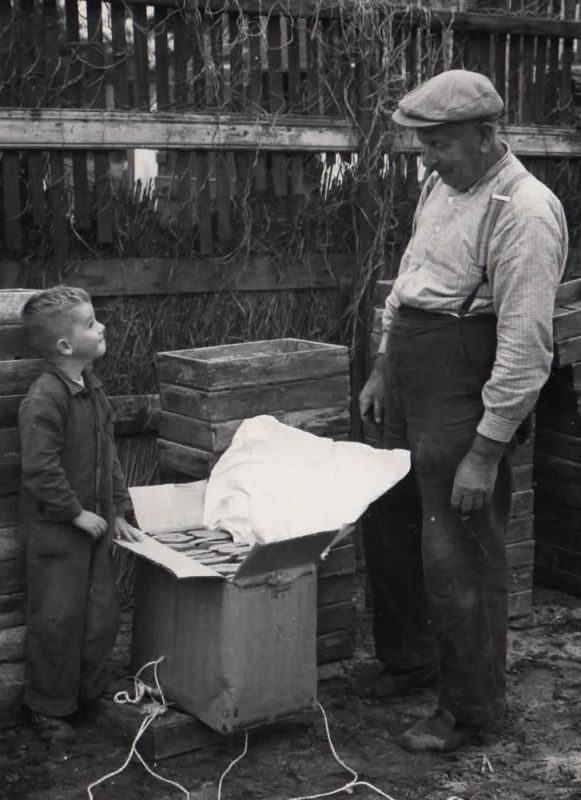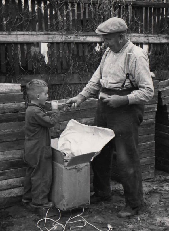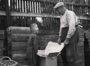 Cor van Dijk knoopt vakkundig een doos met bollen vast,het kleine mannetje kijkt