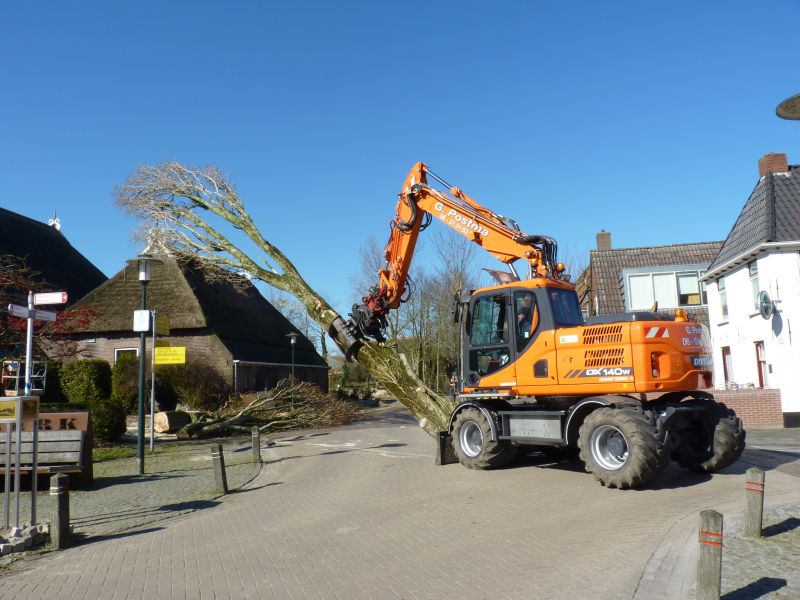 In het midden van de foto haalt de kraan al een andere boom, staande naast het lytshûs, naar beneden.