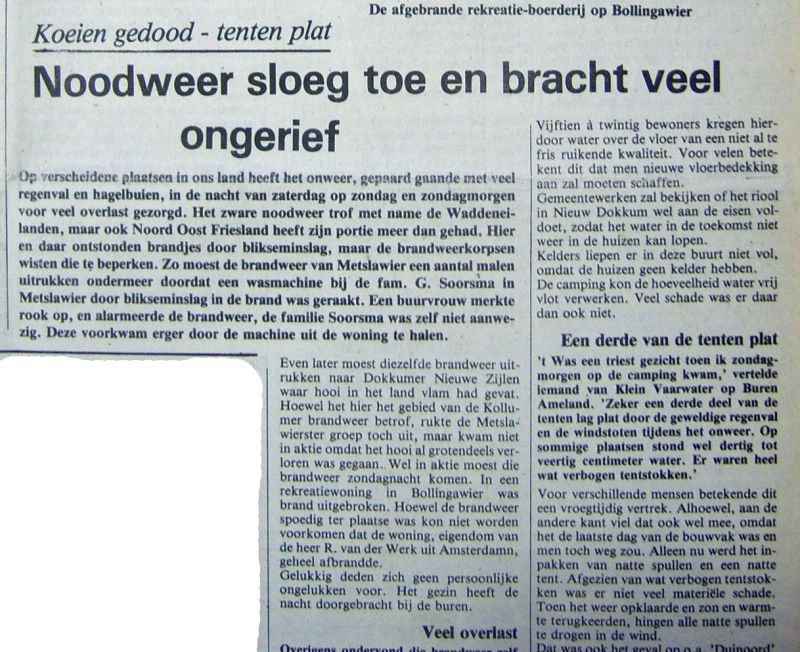 In de nacht van 1 op 2 augustus waren er overal in Nederland zware onweersbuien, met veel inslagen als gevolg. Ook in Noordoost-Friesland moest de brandweer in actie komen. Zo brandde het boerderijtje op Bollingwier, Berchhuzen 5, vrijwel geheel af.