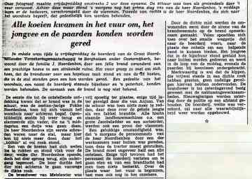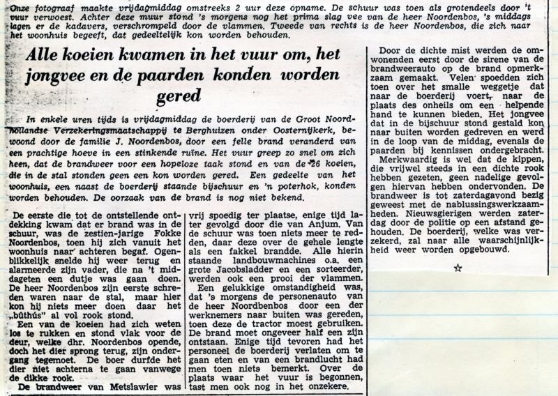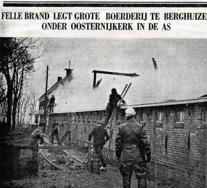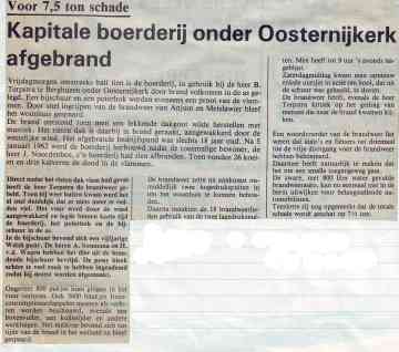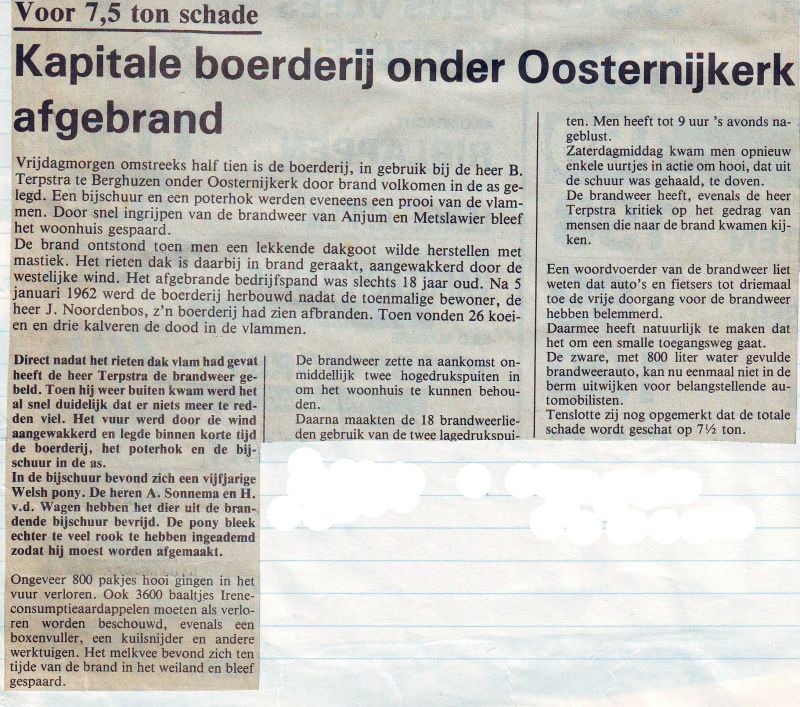 Het betreft de brand in het bedrijfsgedeelte van de boerderij van Boele Terpstra op Bollingwier/Berchhuzen. Dat was met recht een dramatische brand, na een eerdere brand in 1962 (zie hierboven) toen Kobus Noordenbos nog op deze historische boerderij zat. Een verwijt aan de ‘ramptoeristen’, dat zullen meest Easternijtsjerksters geweest zijn, staat in het laatste gedeelte van het artikel!