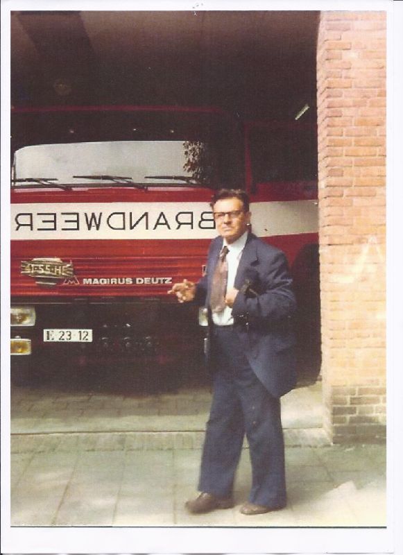 Oud ondercommandant W.Oosterlee voor de nieuwe Magirus autospuit HD (hoge druk)