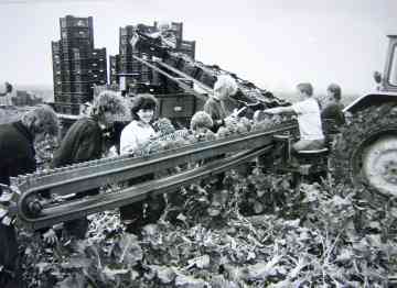 Betekende voorheen het oogsten van veel koolsoorten het voortkruipen van de stugge werkers over het veld en het meeslepen van kratten, op de foto is een gemechaniseerde vorm van de broccoli-oogst te zien.