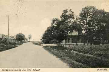 De oudst bekende foto van het christelijk schoolgebouw uit 1902 en de oude woning van de hoofdonderwijzer daarvoor. Verder staat er aan die kant van de Langgrousterwei geen enkel gebouw, pas na 1932 zouden daar woningen worden gebouwd.