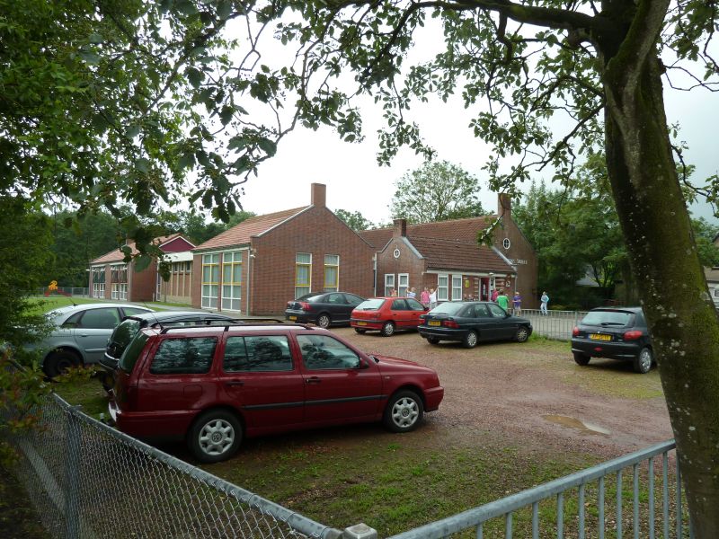 Op deze foto is het gebouw te zien zoals dat in 1953 was ontstaan toen er nog een extra lokaal bij de andere vier lokalen werd aangebouwd.