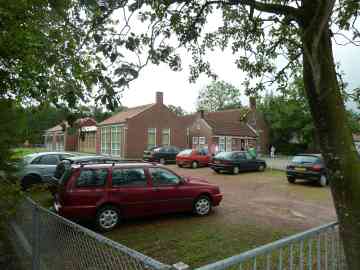 Het lagere schoolgebouw van 1902 aan de voorkant. Het is duidelijk dat de foto van vóór de oorlog is want de bomen staan er allemaal nog: na de oorlog waren ze verdwenen, opgestookt in de kachel.