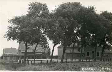 Het eerste huis, nauwelijks zichtbaar, is van 1924. De andere huizen staan in blokjes van twee, steeds bereikbaar dmv een dam over de sloot. Het zijn de eerste huizen van de Woningstichting Oostdongeradeel in Easternijtsjerk, gebouwd in 1919. Ze zijn intussen in 1975-1976 afgebroken en vervangen door een aantal huizen rondom een plantsoentje, dus niet meer langs de straat zoals op de foto.