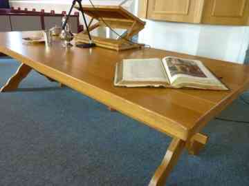 Op sa’n repetysjejûn kamen ynienen, alhiel ferstuivere, de diakens it lokaal ynfleanen. Direkteur Blom sloech ôf en frege de mannen wêrom’t se repetysje sa ynienen fersteuren. Wat wie it gefal? De diakens wiene yn de tsjerke dwaande om alles klear te setten foar it Hillich Nachtmiel dat de oare dei hâlden wurde soe. Se hiene lykwols sa drok meiïnoar yn petear west dat se in walmjende oaljelampe alhiel fergetten wiene. It gefolch wie dat alles ûnder it roet siet: it lekken, de bekers, de banke, alles!