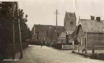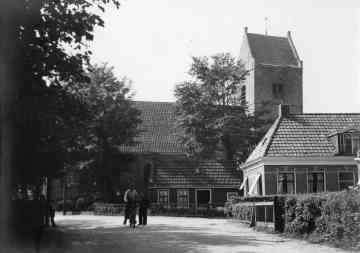 Vóór het kerkgebouw is nog een klein huisje te zien dat in de tuin stond van de bakkerij (achter de pomp) op de hoek met De Lyts Ein.