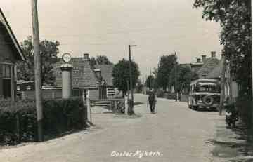 Gezien richting Nesserhoeke met prominent in beeld de bus van de firma Weidenaar, terwijl Eelze Weidenaar zelf midden in het beeld loopt. Ook de prachtige Shell-pomp mag gezien worden!