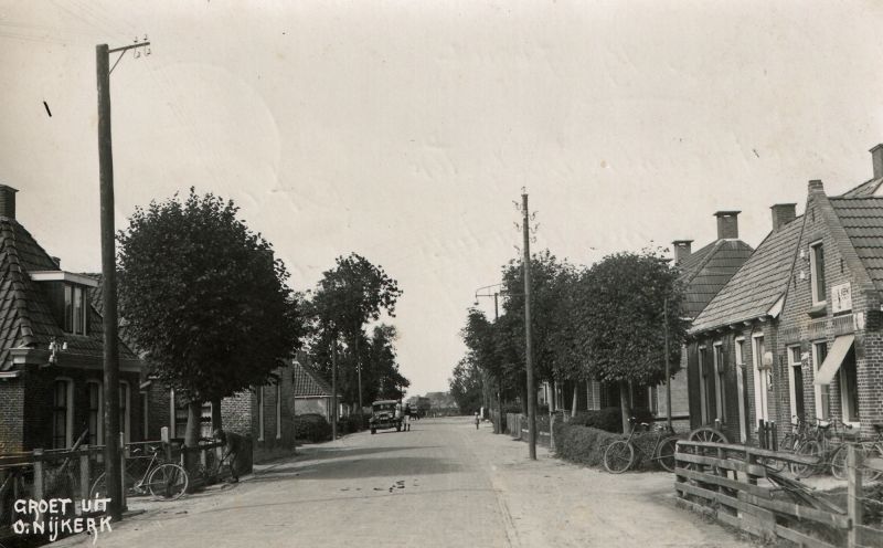 De Buorren precies de andere kant uit gezien, dus naar het westen, richting Nesserhoeke. Voorheen werd deze straat ook wel de ‘Lange Streek’ genoemd, waarvan de bebouwing aan de rechterkant van na 1900 is. Bijvoorbeeld geheel rechts de fietsenmakerij van Sieger Rozendal uit 1908.