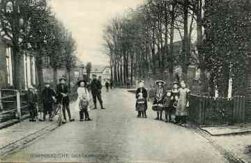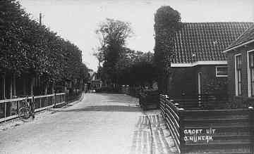 Op de achtergrond de gereformeerde pastorie en midden op de weg (?) een richtingaanwijzer, rechts daarvan de homeie van de boerderij van Anne Ages de Jong.