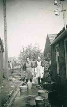 De dames poseren even voor de fotograaf maar hebben het eigenlijk veel te druk met de was, gezien de ‘tobbe’ rechts en de vele emmers in het steegje met een nuttige goot om het water te laten wegstromen. Achter de dames hangen nog kleden over het hek.