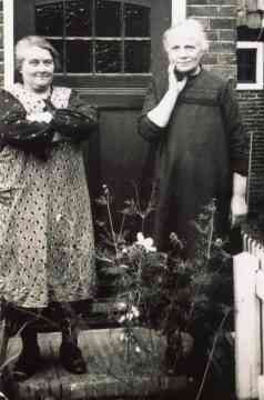 Deze dames hebben even tijd voor een praatje met de overbuurvrouw. Jeltje Minnema woonde waar nu De Lyts Ein 3 is en Keimpkje woonde er precies tegenover in De Lyts Ein 6.