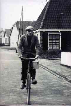 Hier fietst schilder Rense Cuperus met een verfblik aan het stuur langs zijn (intussen verdwenen) woning De Lyts Ein 5: niet zichtbaar achter het witte hek.