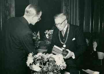 Afscheid Burgemeester A.C. de Wilde. J. van Stege overhandigd een cadeau namens