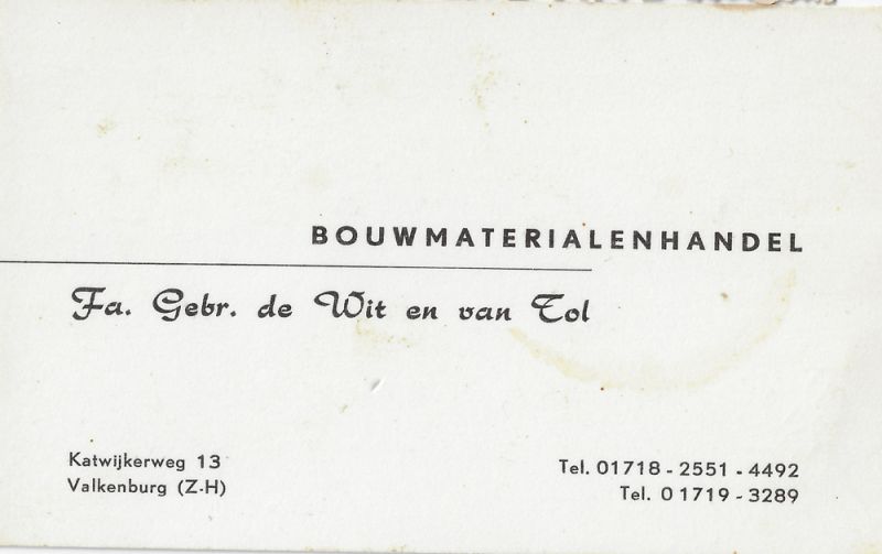 Het visitekaartje van fa. de Wit en van Tol uit de jaren 60 (let op de telefoonn