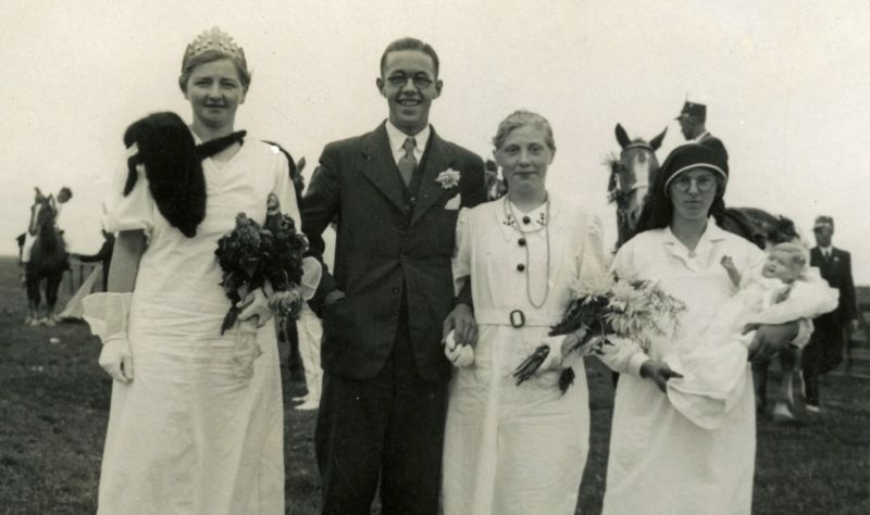 Vier vrolijk verklede personen uit Easternijtsjerk die deelnemen aan de optocht tijdens de dorpsfeesten. Bij nadere beschouwing blijken ze ook iets uit te beelden. De meest linkse draagt een kroon, zij zal wel de koningin voor moeten stellen, waarschijnlijk Koningin Wilhelmina want de foto is van voor de oorlog. Dan krijg je iemand die misschien Prins Bernard zou kunnen zijn, dan moet de volgende wel Prinses Juliana verbeelden terwijl de laatste persoon een dienstmeisje kan zijn met op haar armen de eerstgeborene van Juliana en Bernard, de kleine Prinses Beatrix, geboren 31 januari 1938. Waardoor deze foto gemaakt zal zijn tijdens de dorpsfeesten in de zomer van 1938.