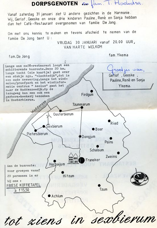 Dorpshuis De Terp Gerelateerde informatieOnderwerpenFoto’sFilm en VideoGeluidsfragmentenDocumenten 1987, aan de dorpsgenotenWelkom in café restaurant SexbierumDisclaimer 1987, Gerlof en Geeske YkemaDisclaimer × IIIF Viewer ×