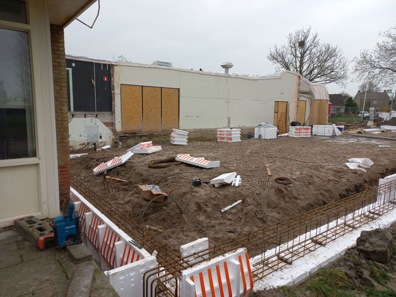 Door subsidies van verschillende fondsen en een stevige bijdrage van het eigen dorp (door allerlei acties) kon die uitbreiding gerealiseerd worden. Hier wordt de fundering van de uitbreiding gelegd.
