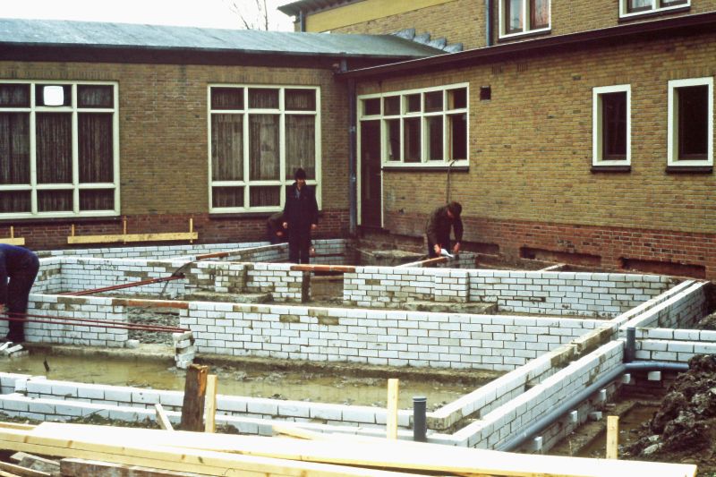 Door subsidies van verschillende fondsen en een stevige bijdrage van het eigen dorp (door allerlei acties) kon die uitbreiding gerealiseerd worden. Hier wordt de fundering van de uitbreiding gelegd.