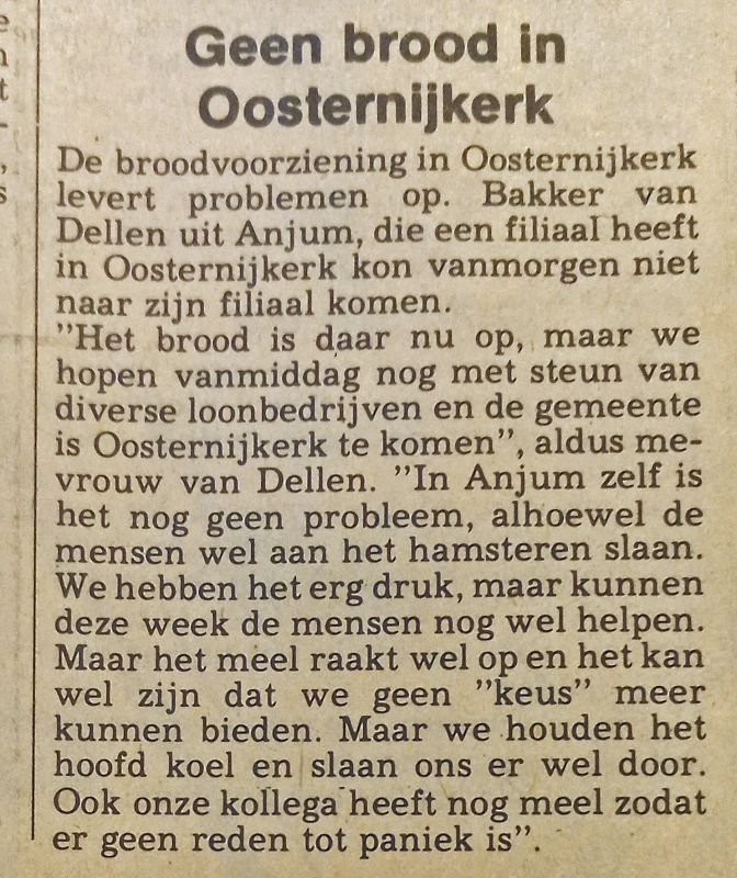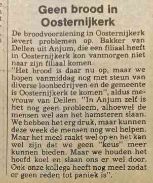 1979, een klein stukje in de krant over de strenge winter van 1979 waar bakker van Dellen met behulp van loonbedrijven en gemeente brood haalt uit Anjum voor de inwoners van Easternijtsjerk.