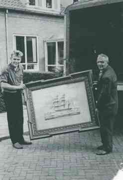 Hier op het Boonrak is Dirk Rosmolen en ? een schilderij voorzichtig aan het in-