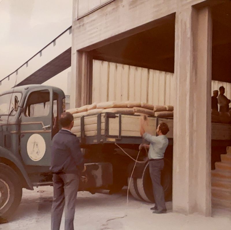 Rian Rosmolen trots achter stuur van een vrachtauto van broer Aad Rosmolen. Het