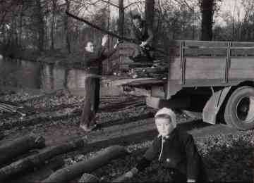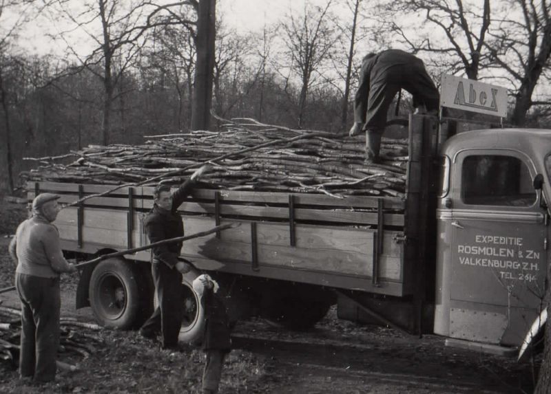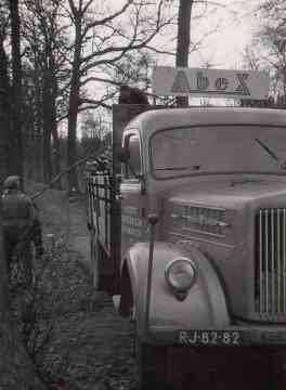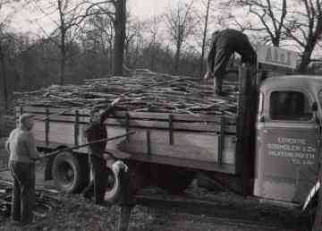 Hier wordt in een bos (locatie Zuidwijk) een vrachtwagen van Rosmolen beladen do