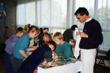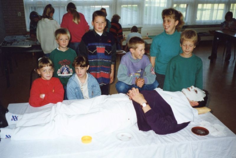Donderdagmiddag 2 uur, tijd voor expressie. Er zijn meerdere onderdelen zoals textiel, papier, toneel, keukelen, hout en klei. Toen Janine Lous nog meewerkte aan deze middag nam ze één keer per cursusblok haar man dominee Cees Lous mee. Op de eerste foto ligt hij languit op de tafel als ‘slachtoffer’ om een gipsmasker te laten maken. Geert Hoekstra, Arjen Brouwer, Gert Jan Overeem, Karlijn Jansen, Johan Slagman (achter) en Geanna Tanja en Froukje Cuperus hebben duidelijk zin om de dominee eens goed in te smeren met gips! Ten bewijze dat hij het echt is, dient de tweede foto.'