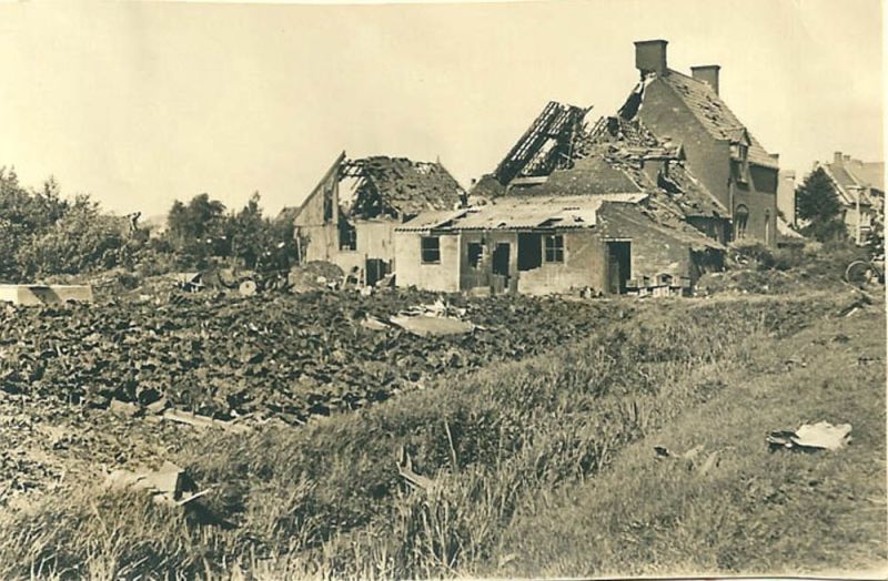 plaats waar ik mij bevond. Wat hierna gebeurd heb ik niet meer gezien, alleen hoorde ik een zware slag. Toen ik weer opkeek om te zien waar het toestel was, zag ik aan de linkerzijde der weg een zwaar beschadig huis en meende dat het