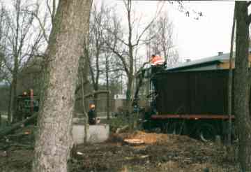 In 1999/2000 worden de bomen in het achterste gedeelte van de pastorietuin gerooid: er zijn bouwplannen. Geheel rechts, net boven de laadbak van de vrachtwagen, is het dak van De Terp zichtbaar.